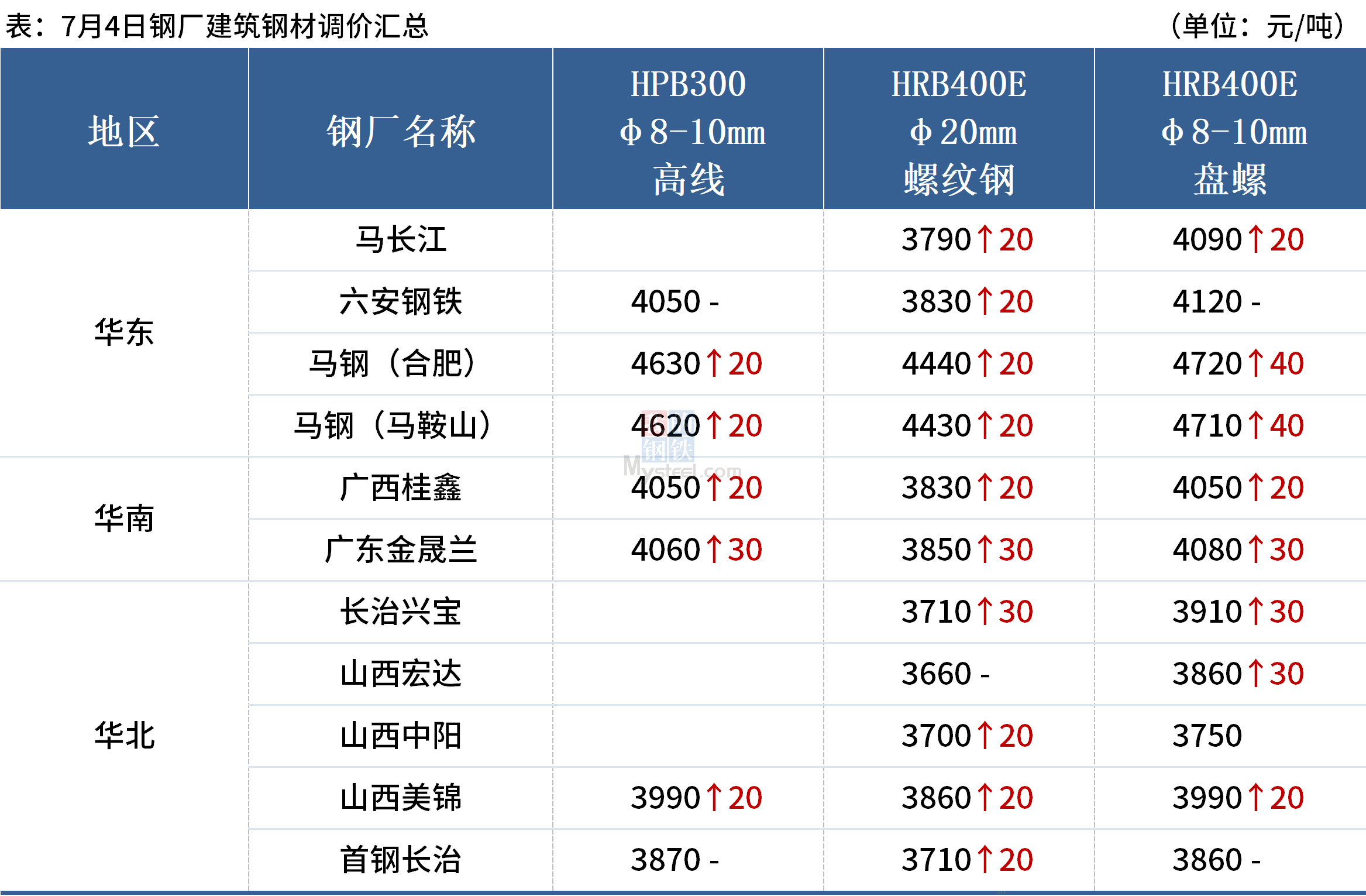 7月4日,全国累计10家钢厂发布调价信息,整体价格上涨,涨幅在0-40元/吨。