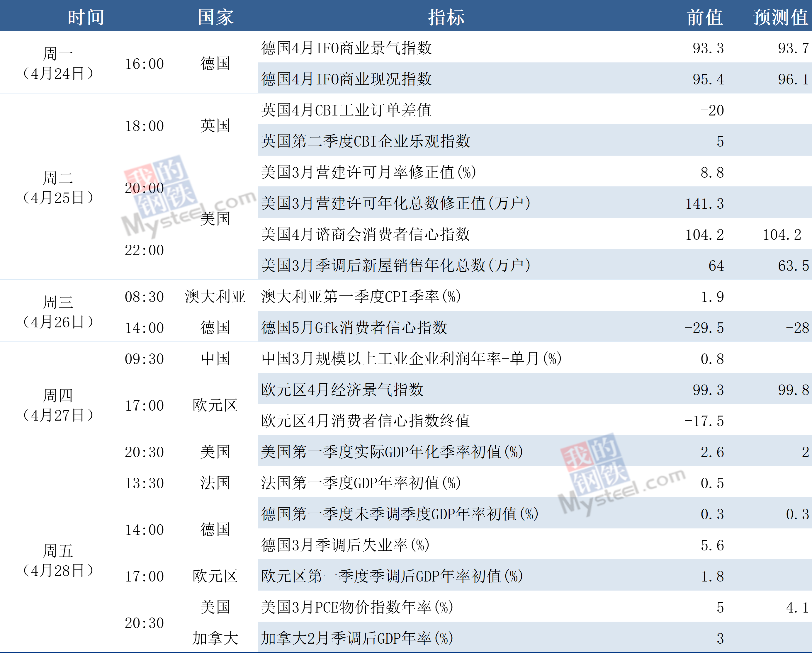 宏观资讯:中国一季度GDP284997亿元,同比增长4.5%;国家统计局称今年二季度经济增速或比一季度明显加快,三、四季度增速会有所回落;国家发改委称坚决遏制铁矿石价格的不合理上涨;欧盟将对进口钢铁等征收碳税;美国首次申请失业救济金的人数为24.5万人,连续两周上升。