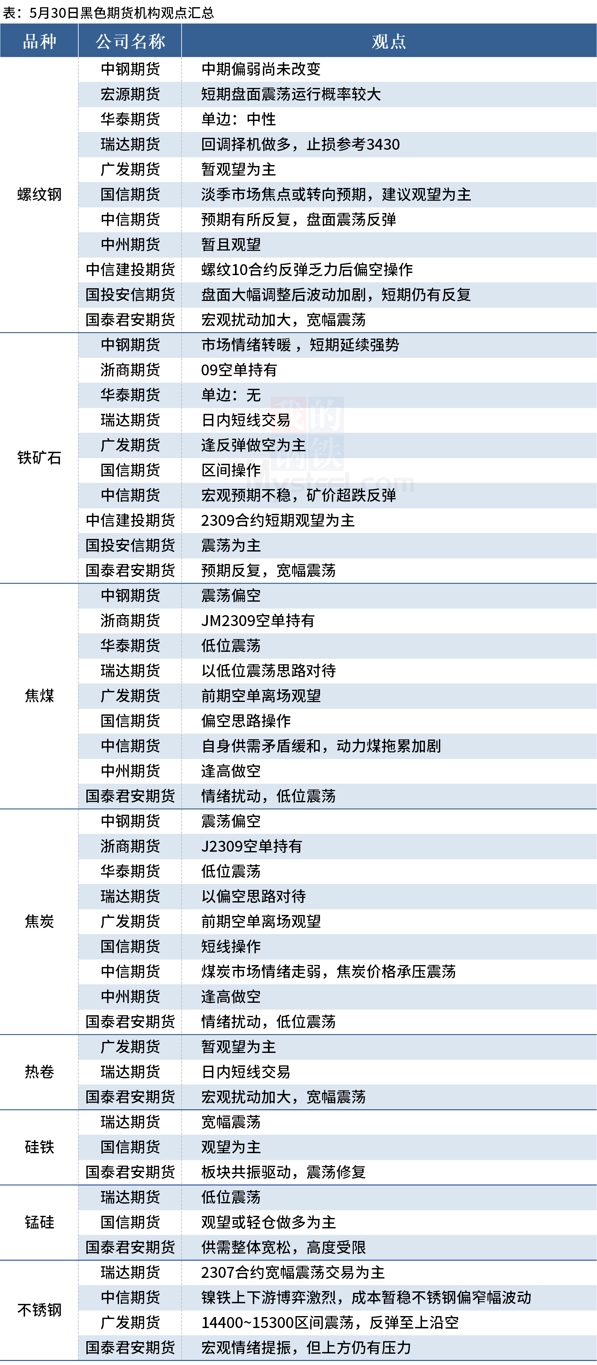 据Mysteel统计5月30日11家期货机构操作策略,其中多数机构料螺纹钢震荡运行,铁矿石震荡运行,焦煤、焦炭震荡偏弱。具体汇总内容如下: