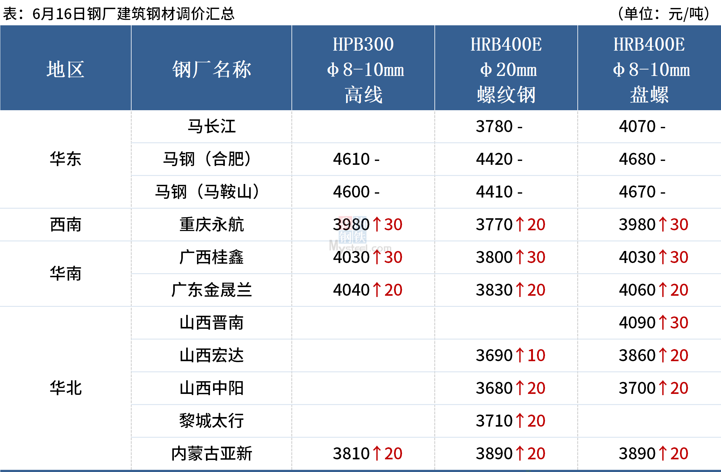 6月16日,全国累计10家钢厂发布调价信息,其中8家钢厂涨价,整体涨幅在10-30元/吨。