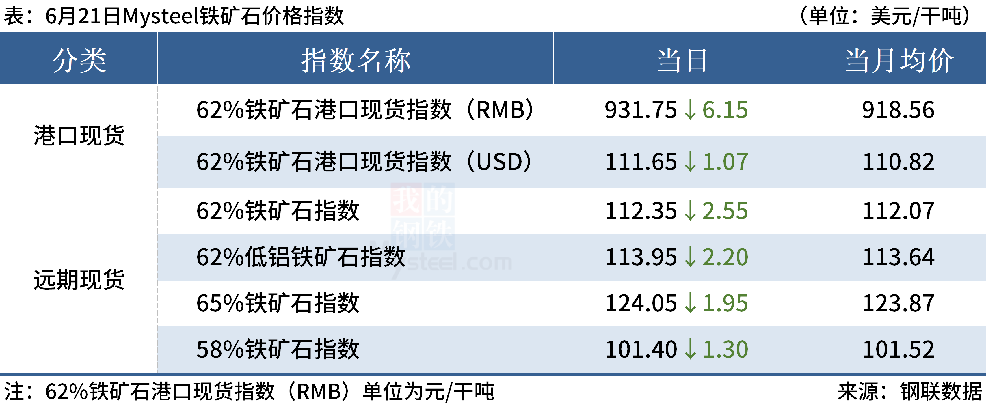 ◎ 6月21日,全国主港铁矿石成交75.50万吨,环比减38.6%;237家主流贸易商建材成交13.89万吨,环比减5.2%。