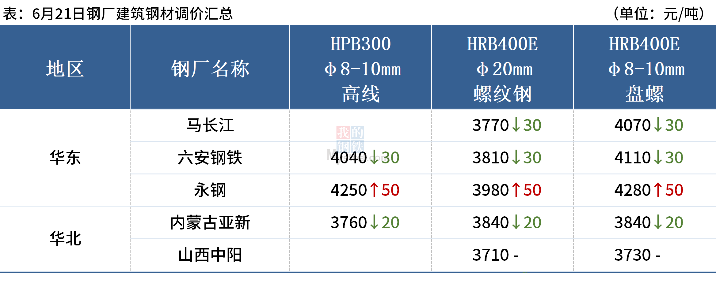 ◎ 6月21日Mysteel统计40家独立电弧炉建筑钢材钢厂平均成本为3916元/吨,周环比增加26元/吨,平均利润为-112元/吨,谷电利润为-10元/吨,周环比下降4元/吨。