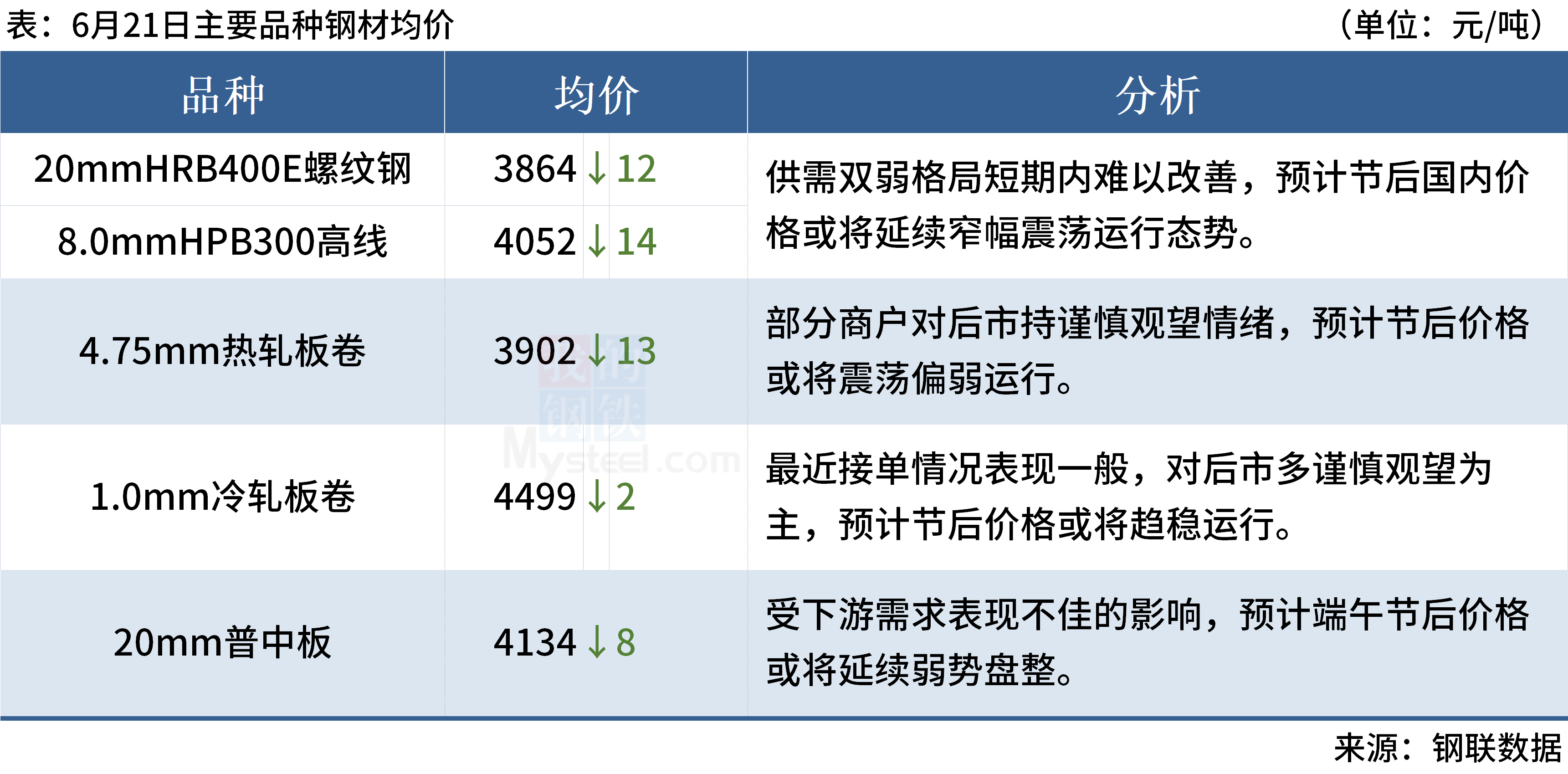 ◎ 端午节期间,热卷现货价格企稳为主,螺纹价格则相对较弱,成交偏差,市场情绪仍旧谨慎,关注假期后是否有刚需补库行为。端午节期间,唐山迁安普方坯降40报3500元/吨。钢坏钢厂直发、市场表现均弱,周六主流仓储小幅累库,下游成材随坏价弱调,成交清淡。详情>>