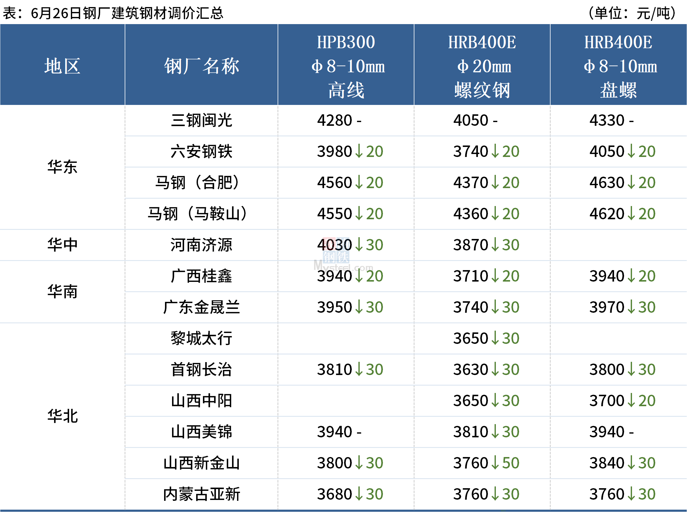 6月26日,全国累计12家钢厂发布调价信息,其中11家钢厂降价,降幅在20-50元/吨。