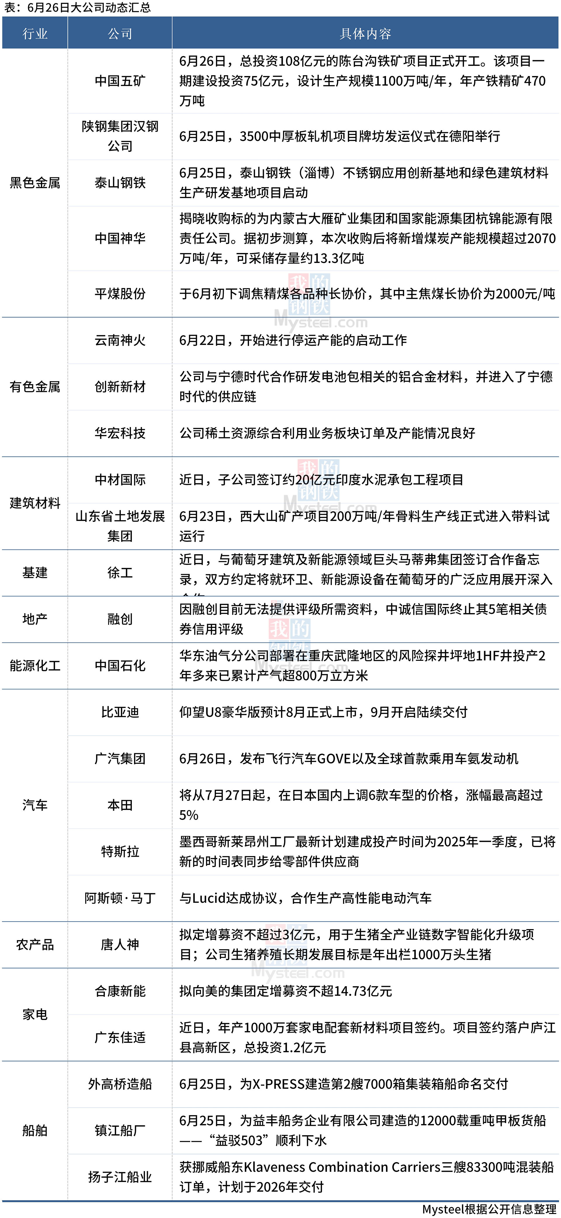 6月27日,Mysteel汇总部分大宗商品相关企业动态。